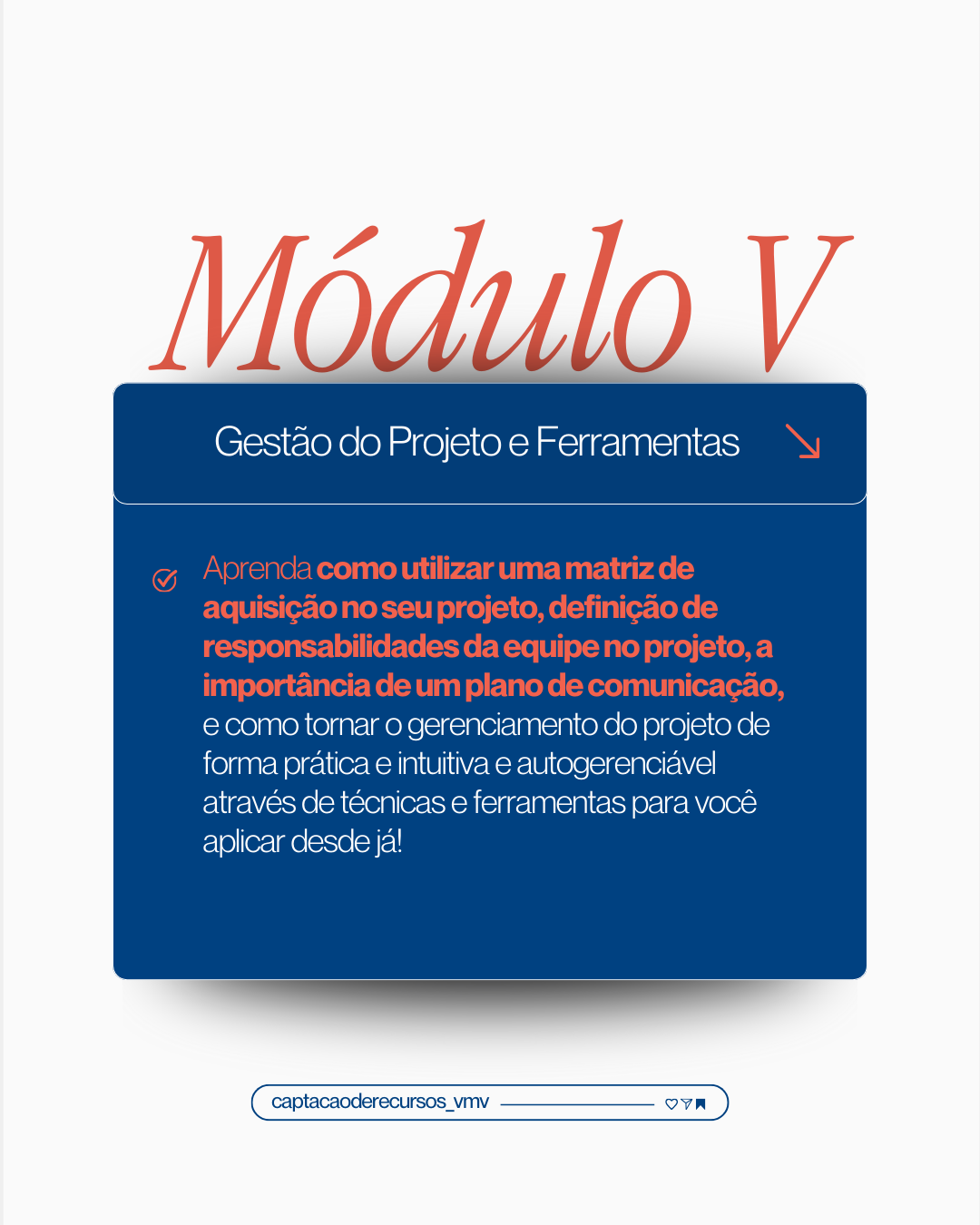 Você terá acesso a um método validado que já aprovou dezenas de milhões de reais em recursos, acompanhamento direto comigo, Vinnicius Ventura, e o apoio de uma comunidade que compartilha o mesmo objetivo que você: aprovar projetos e captar recursos com resultados reais.