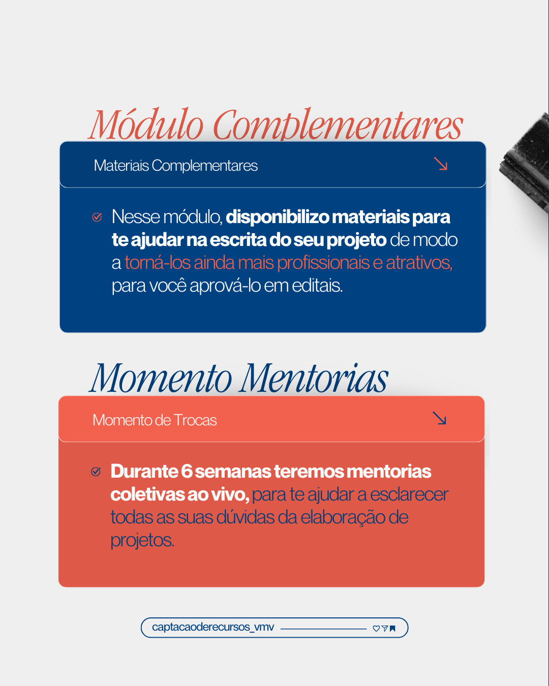 Nos últimos anos, percebi como é solitária a jornada de quem escreve projetos ou tenta aprender sozinho. A mentoria é o nosso encontro quinzenal, ao vivo, com participantes de todo o Brasil. Você poderá fazer perguntas, tirar dúvidas, trocar experiências e aprender com desafios reais.